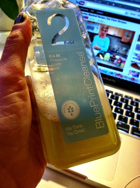 I am doing a 3 day cleanse with BluePrint. It consists of 6 juices, 3 green and 3 others. The others are P.A.M (pineapple, apple and mint), Spicy Lemonade, and Cashew Milk. If you are really hungry you may eat 1/4 of an avocado, celery, or vegetable broth. You are also encouraged to drink water and green tea throughout the day.