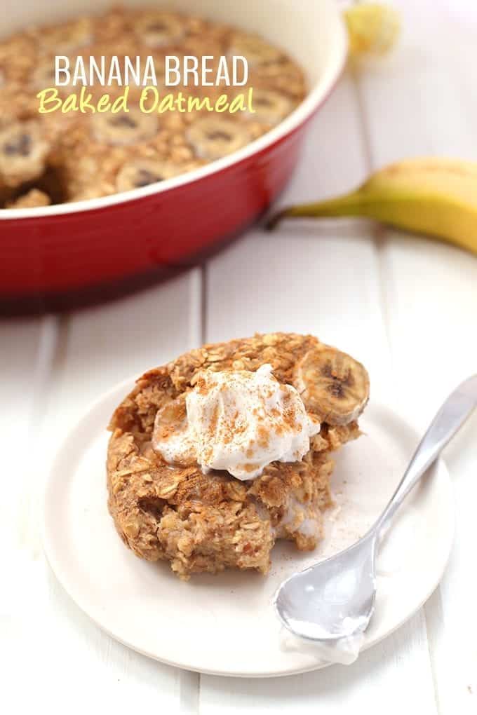 A delicious recipe for Banana Bread Baked Oatmeal that is vegan and gluten-free and packed-full of fiber. An easy weekday breakfast or weekend brunch recipe to serve a crowd.